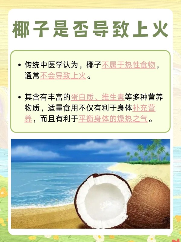 ❣从中医角度看,椰子味甘、性凉,入胃、脾、大肠经,一般不会导致上火。