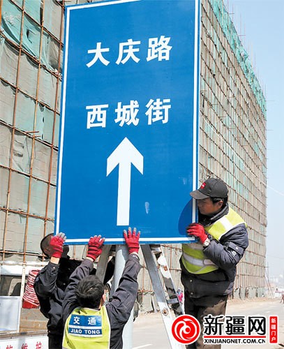 4月5日,在九家湾水库街,市公安局交警支队交通科工人在安装道路指示牌。