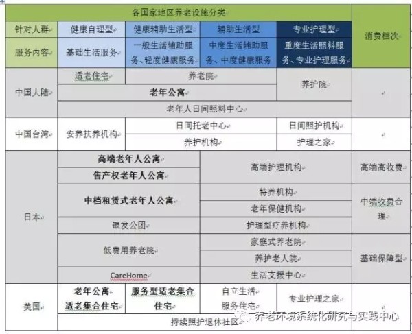 在这些非常纷繁复杂的分类中,各个国家对老年建筑的分类都有其自身的内在规律与分类原则。可以看出,一般将入住者年龄和身心状态、老年人需求及对应服务的种类作为主要划分依据。