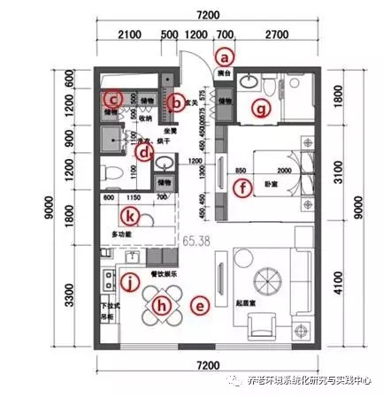 (h) 餐厅空间适度放大,一方面方便老人厨房活动,另一方面为老年人提供了除就餐之外的日常休闲及访客聚会活动空间。