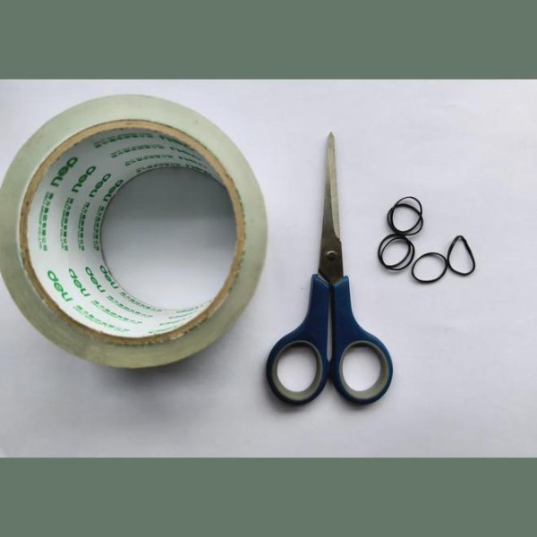 树枝、颜色品种各异的花草、宽透明胶带、小皮筋、剪刀