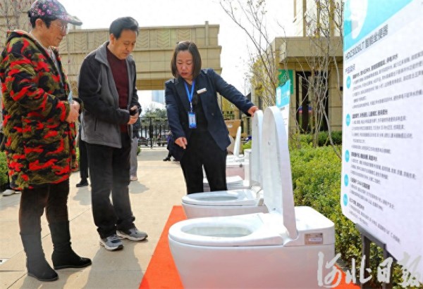 4月9日,秦皇岛市海港区白塔岭街道海悦公馆社区,商家为居民介绍智能卫浴产品和家装以旧换新补贴政策。