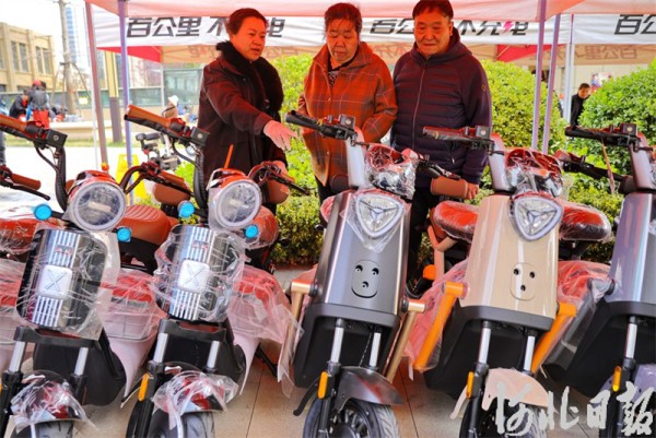 4月9日,秦皇岛市海港区白塔岭街道海悦公馆社区,商家为居民介绍电动自行车产品和电动自行车以旧换新补贴政策。