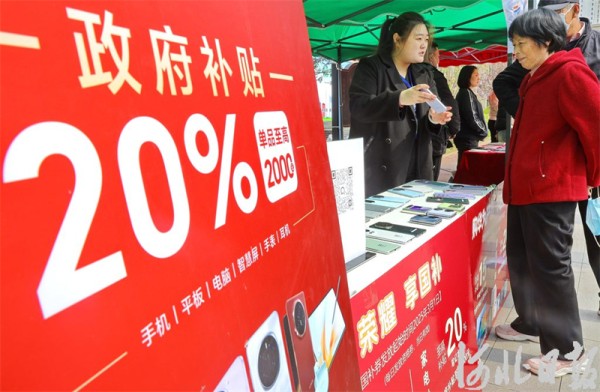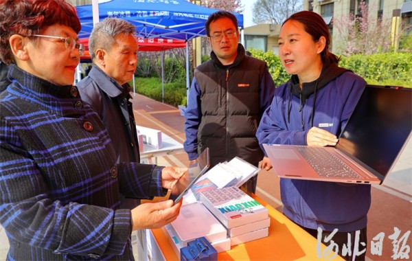 4月9日,秦皇岛市海港区白塔岭街道海悦公馆社区,商家为居民介绍数码产品及数码产品购新补贴政策。