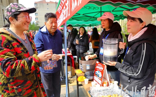 4月9日,秦皇岛市海港区白塔岭街道海悦公馆社区,商家为居民介绍家电产品及家电以旧换新补贴政策。