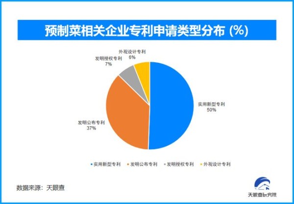 对于预制菜中的技术与工艺,天眼查专业版数据显示,截至目前,预制菜相关的专利申请共为1042条,其中实用新型专利占比50%,达到其他三项专利申请数量的总和;其次发明公布专利占比37%。可以看到,对于预制菜而言,餐品的创新、改进、工艺研发等方面是众多企业所着重考虑的关键要素。