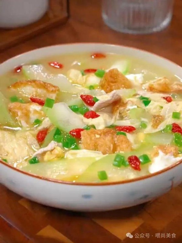准备食材:冬瓜、鸡蛋、肉片、腐皮、盐、鸡精、葱花、枸杞、食用油