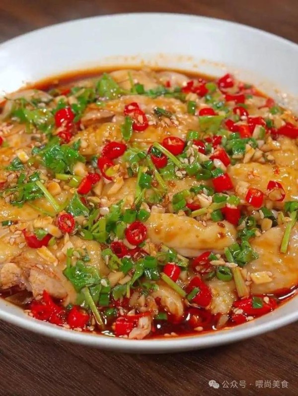 4、将花椒油、鸡精和煮鸡原汤混合均匀,调成口水鸡的调味汁,将调味汁淋在鸡腿肉上,即可上桌享用。