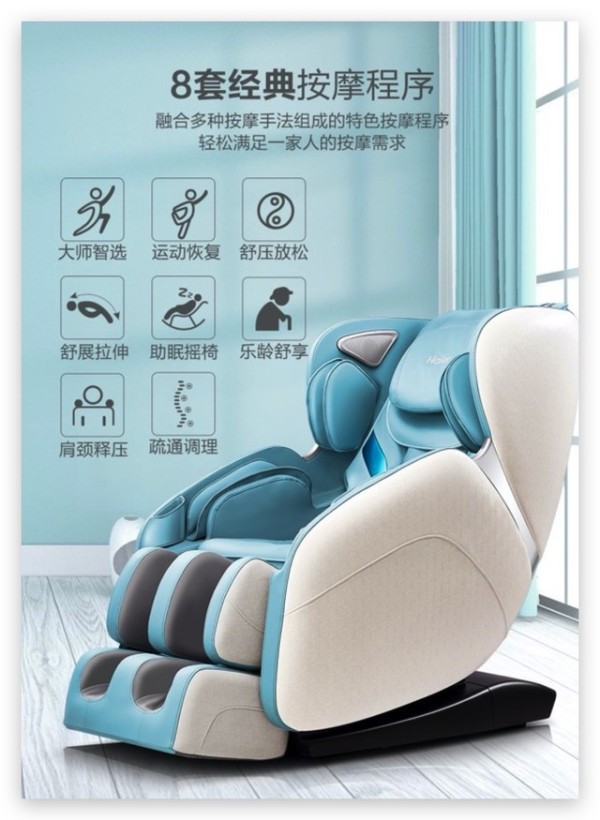 该款机型支持8套经典按摩程序,并融合多种按摩手法组成的特色程序,搭配上智能3D“按摩手”,实现上下、左右、前后、定点多维按摩,按摩力度、幅度可调节推拿、揉捏、拍打、捶打、指压、揉拍、揉捶、揉刮独特按摩手法,拔开酸痛点,触达深层疲劳肌肉组织。假期期间用它来放松筋骨,再好不过了。