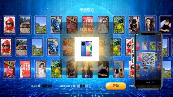 用户现场自拍上传照片,巨幕照片墙抽奖,大屏幕在抽取之前展示奖品卡片,下方是控制按钮。开始抽奖后,奖品会变成正方体,头像组成拱形的围墙形,上下一共四圈,单双层呈现不同的旋转方向,卡片上的头像不断在变幻,点击停止抽奖后,会弹出中奖的用户,并依次排列开来。