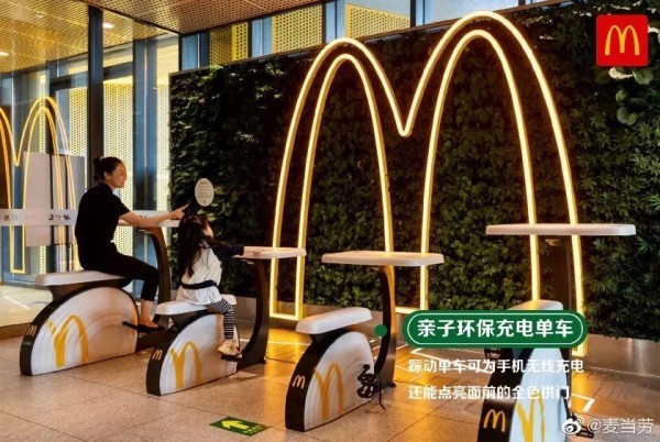 惊喜的是,餐厅内设置了亲子环保充电单车,踩动单车即可为手机无线充电并点亮金色拱门logo,环保之余为顾客提供互动新体验。