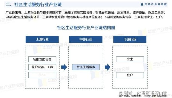 产业链来看,上游为设备与技术供应环节,涵盖了智能安防设备、智能养老设备、康复辅具、监护设备、保洁工具等;中游为社区生活服务环节,主要涉及住宅物业管理服务与社区增值服务;下游则是的服务对象,主要包括业主、住户。