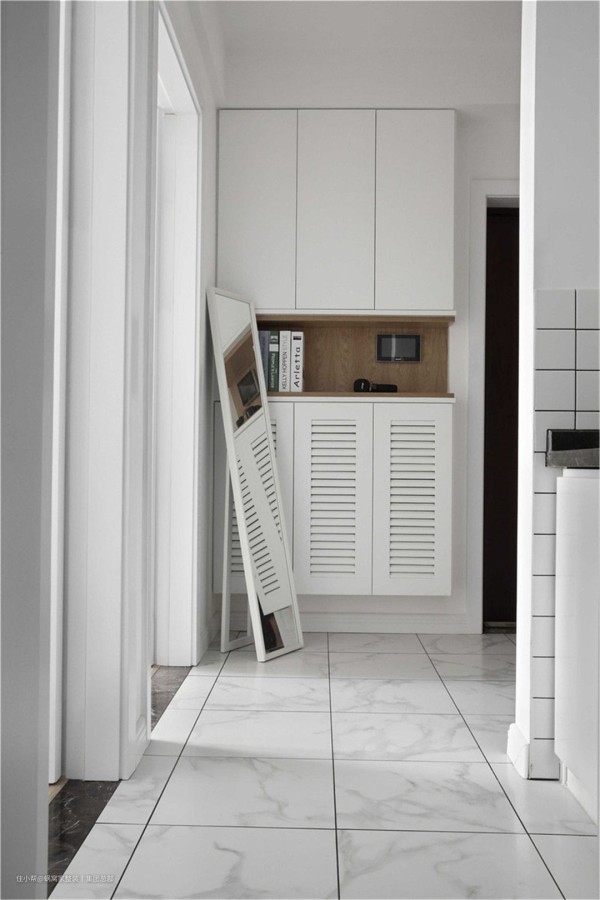 玄关柜离地设计,底部可以放鞋子,不用弯腰存放。中间留空,放置随手物品。解放双手,搭配全身镜,美美哒出门。