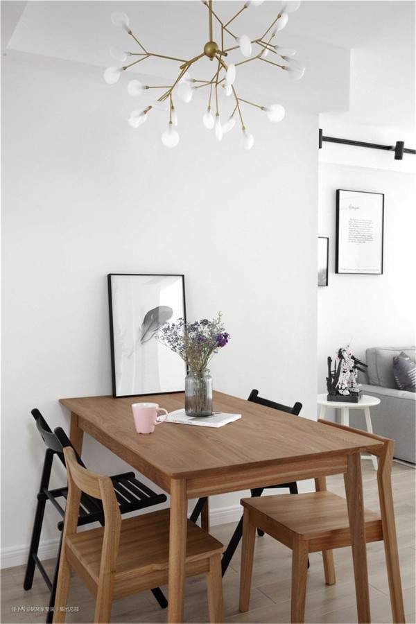 餐厅和客厅相接,一套简单的木质餐桌餐椅靠墙摆放,营造出随性自在的就餐氛围。