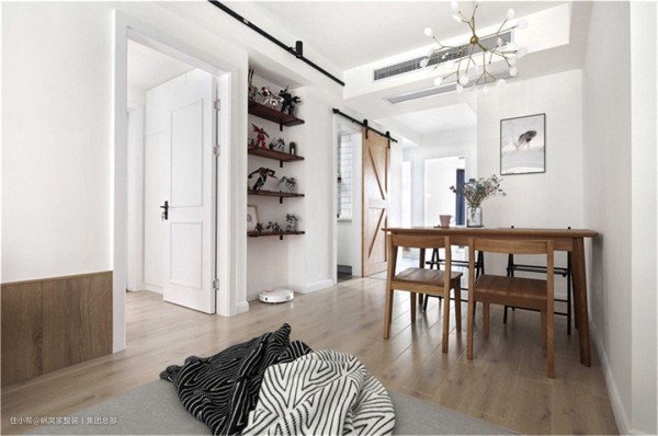 餐厅对面设计师利用墙体凹陷的结构,将几块木板上墙,为业主增加收纳展示高达模型的空间,看上去很不错。