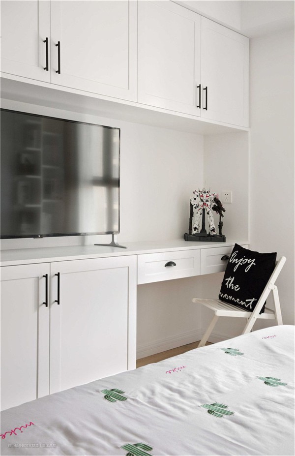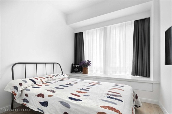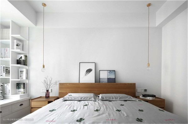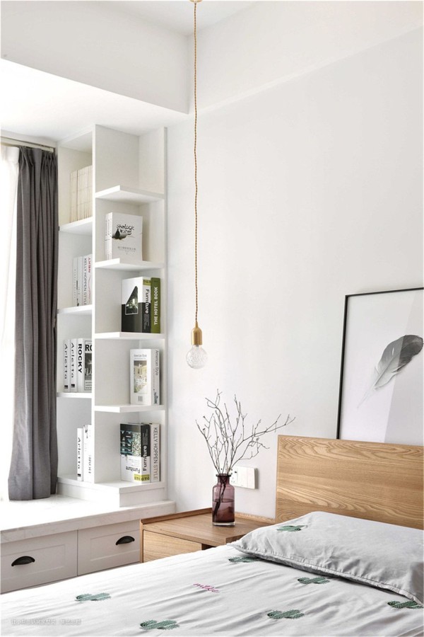白色的床铺,白色飘窗,一个白色的小书架,整体白色的搭配简洁干净。次卧也是沿用了和主卧相似的颜色搭配,简单而美好。