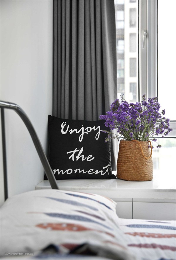 穿过整洁舒适的客厅,来到业主的阳台。黑格装饰的玻璃窗,灰色的地板,配上白色方格的瓷砖,是经典的黑白灰色彩搭配,简约干净。