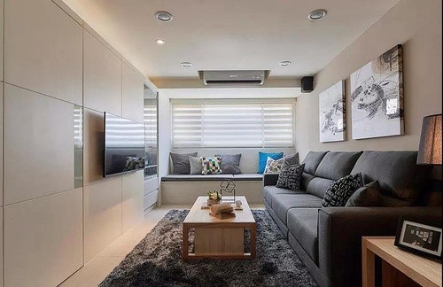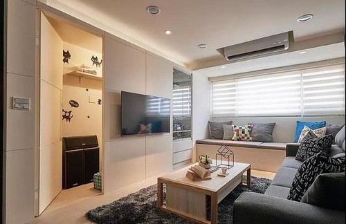 ▼在电视墙后方以隐藏门的方式,规划一间可以置放大型对象的储藏室;靠窗区的卧榻,则兼有座椅及上掀式收纳的机能。