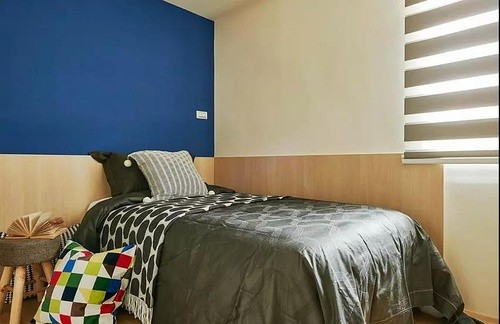 ▼以蓝色调为主的男孩房,立面以带有温润质感的木质元素围塑,轻轻点染空间的休闲调性。