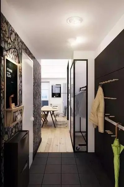 ▲按布局设置动线,延展空间、增强功能性作用。玄关处也“机关”重重,隐形的换鞋柜,墙面一排挂衣区,很方便。