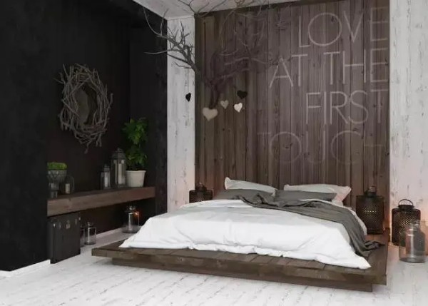 ▲卧室设计融入了自然的元素,背景墙木质板镶嵌一颗小树,整体室内的家具材料与床板结合一处,相当于一处森林中的小屋,安静与自然融洽的很。这样的背景墙原始感中带给人一种宁静的休息氛围。