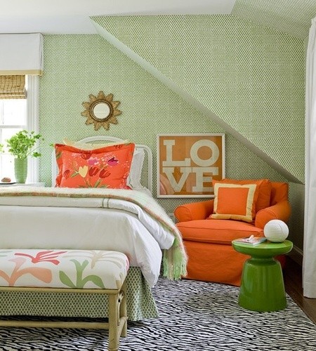 这款异形的女生卧室,一点也没有受到异形墙体的阻碍。以绿色为主的卧室主色调给生活带去很多活力的生机。搭配的红色的单人沙发椅,安静中带有一份欢乐,优雅的小床上被温馨的床品铺满,是每一个浪漫生活的开始。