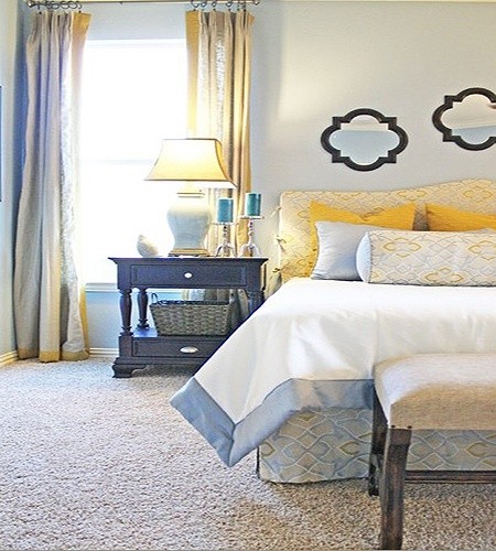 清新的色彩以及自由的花色图案,让卧室生活展现出随意与轻松的感觉,毛绒的地毯在卧室里,增加温馨的生活情调。简单的背景墙设计,减少了居室单调性,镜子的添置也让生活丰富很多。