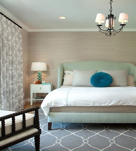 这种大方的卧室设计,简单的色调较为适合都市白领女性的卧室装饰。优雅的浅绿色皮艺床,搭配整个现代风格的卧室装饰,甜美而自然。精致小巧的床头柜以及时尚小台灯,让卧室生活明亮起来。