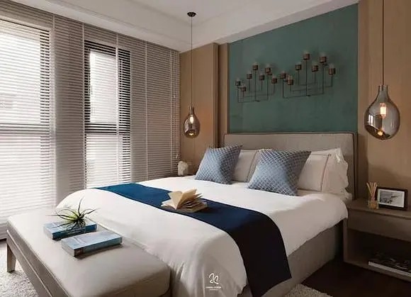 宝蓝色的寝具、海绿色的墙壁加上时尚的灯光照明,这些精心的设计和布置让卧室摇身一变成一间华丽的酒店套房,真让人羡慕。