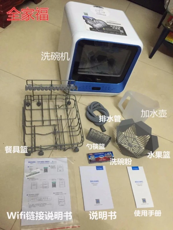 开箱之后取出洗碗机,所有配件都装在洗碗仓里,配件有洗碗篮,果蔬篮,筷勺篮,排水管,加水器,洗碗粉,和使用说明书,快速操作手册,蓝牙无线连接说明书!