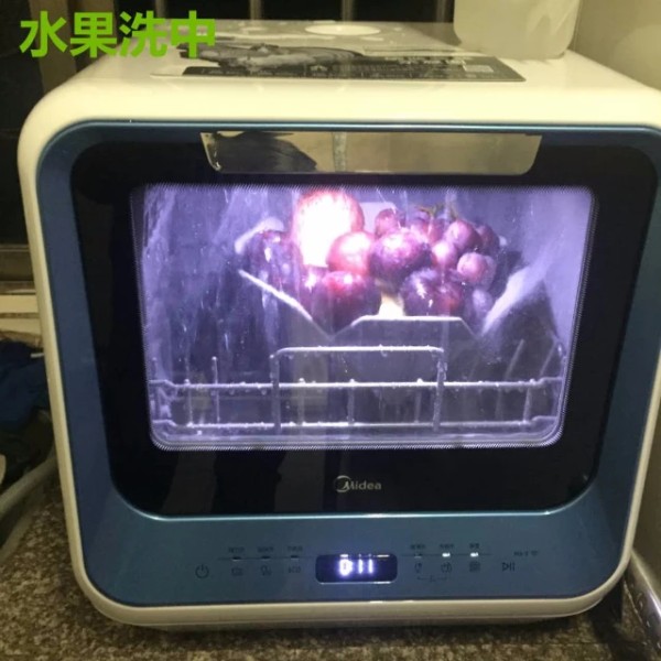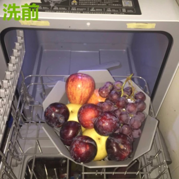 洗完盘盘碗碗,是时候试一下美的M3-T免安装洗碗机水果洗功能了,要使用上面提及的水果篮,就是洗水果专用的。将事先准备好的苹果,梨,葡萄,黑布林排放在水果篮里,然后打开仓门拉出洗碗蓝,把洗碗篮中间的支架放倒,腾出空间来放置水果篮,然后洗碗篮推进仓室,接着往洗碗粉放置槽放一勺苏打粉(根据使用手册,洗水果可以加少许苏打粉),关上仓门,加满5升水,约3满壶,加满时洗碗机发出“滴滴滴”提示音,水便加满了,长触2秒电源键,洗碗机开启,选触水果洗功能,最后再触启动开关,水果洗就开始了,LED屏幕显示全过程时间12分钟,水温加热至36度。同样仓实内放出第一趟水,苏打粉融入水中,放水结束,上下喷淋头开始选装冲洗水果,第一趟水通过底部过滤槽反复抽至上下喷淋头冲刷水果,接着放掉第一趟水,然后反复放出几趟清水,冲洗掉污水,直至12分钟后结束水果洗,仔细观察水果表面,非常光滑干净,特别是葡萄,里面枝条夹杂的脏东西都冲洗得干干净净,水果洗功能给力!