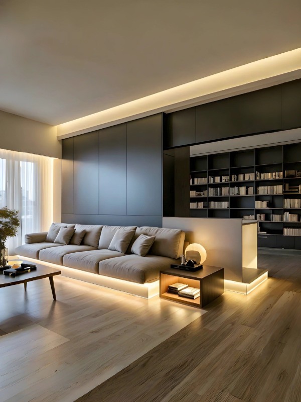 避免交叉干扰:确保沙发与书桌之间留出至少60cm的通道,供人自由走动;若书桌靠近窗户,需保证窗户开启时不影响沙发区的活动空间。 功能分区的隐性划分:通过地面材质(如沙发区铺地毯、书桌区铺木地板)、灯光设计(如沙发区用暖光落地灯、书桌区用冷光射灯)或软装隔断(如半高屏风、书架)实现“软分区”,避免空间割裂感。二、功能协同:从单一用途到多元场景