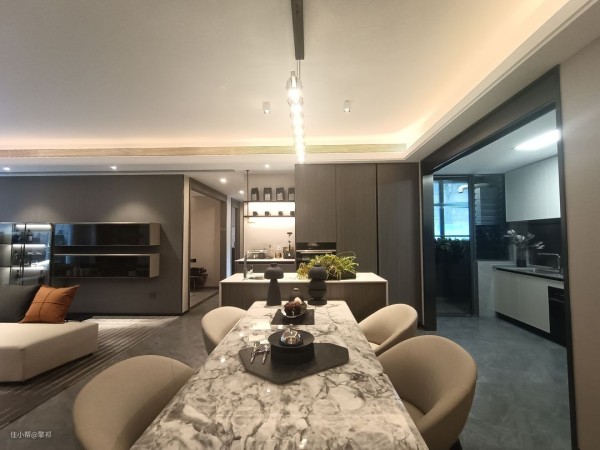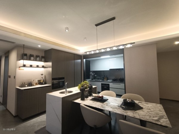 餐厅侧边的餐边柜以咖色为主,同时也是酒柜,保留台面设计,日常的咖啡用具都可以摆放,再搭配条形吊灯,使整体色调氛围与客厅保持一致。 中间留有空间做了吧台设计,方便日常烘使用,同时也展示主人的品质生活。