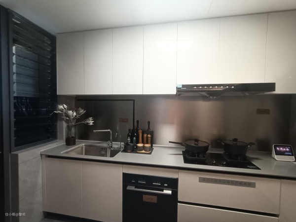 L型橱柜设计,最大化利用空间,在操作动线上让取、洗、切、炒的烹饪更加顺滑。 无把手柜门、内嵌式家电、隐藏式烟机管道的设计都保障了立面的干净整洁,让复杂的空间结构变得更加协调统一。