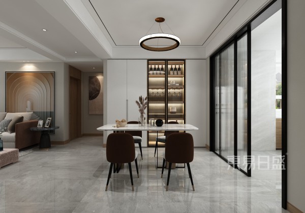 餐厅的一侧做了嵌入式的酒柜,玻璃柜门加上藏光的设计,显得更加的奢华