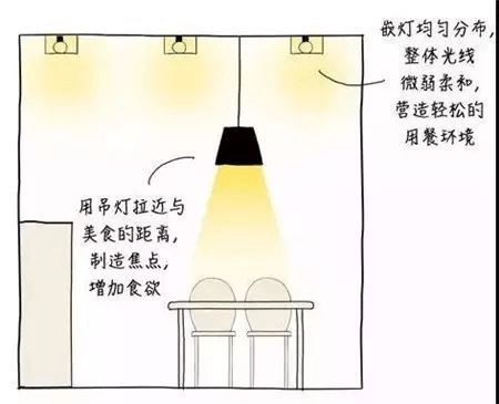 餐厅在照明上需要满足的两个点:一是要看的见菜,而是要看得清楚人。设计照明的目的则是为了更好的展现食物和人的气色。