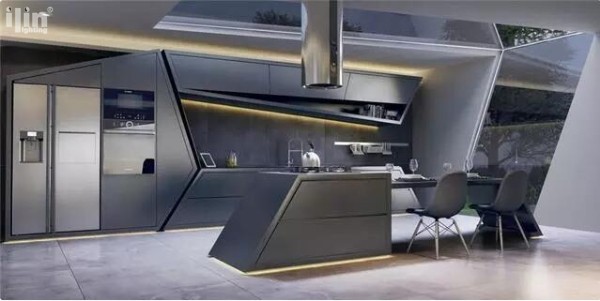 这款未来主义的几何厨房组合非常引人注目,看起来像科幻电影里的太空站。在灯光下引入温暖的白色只是增加了它的魅力。每一个设计单元和墙面单元都有一个发光的下划线,包括厨房操作台。