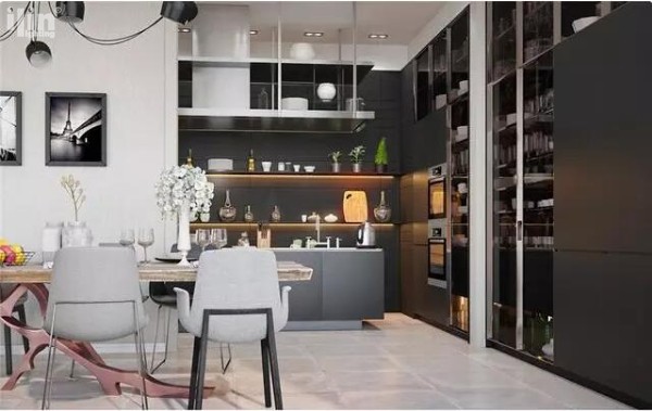 有纹路的厨房橱柜门应该有良好的照明设计去体现其设计特点的深度,这里的厨房设计也有一个黑色的特色墙。