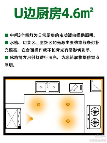 U型厨房4.6㎡:筒灯+射灯+线条灯