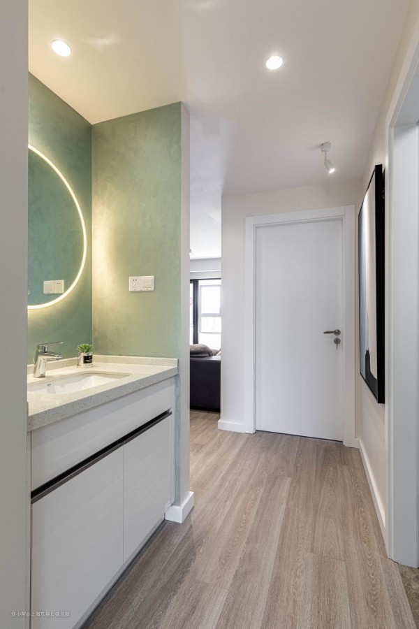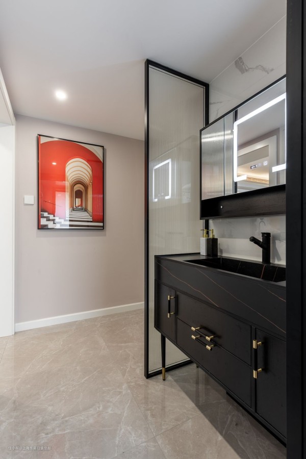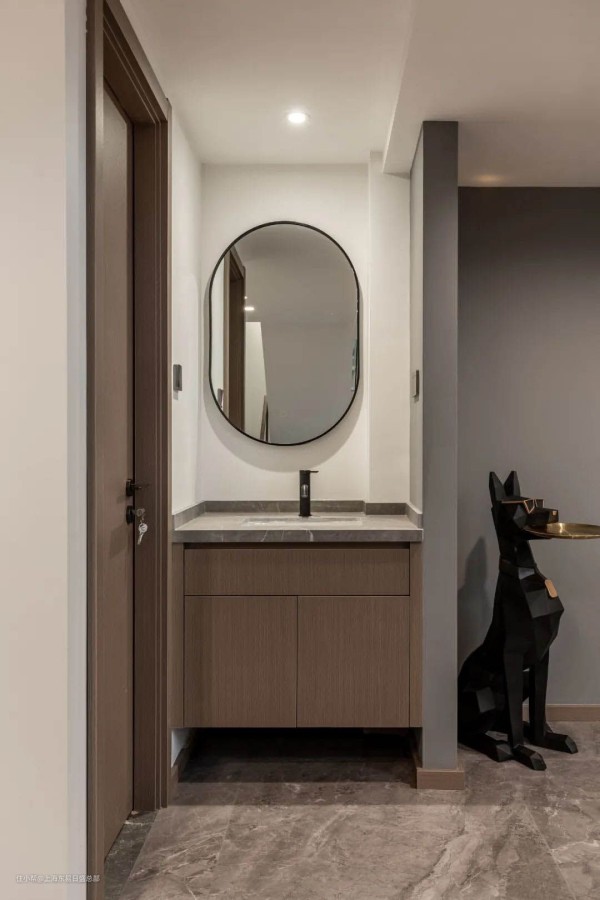 洗手台做外置处理,不仅可以保证干湿分离,提升空间利用率,还能够营造空间亮点。一般是做隔断造型,划分出单独的洗手台区域,小易今天带大家梳理一下常见的几种改造思路: