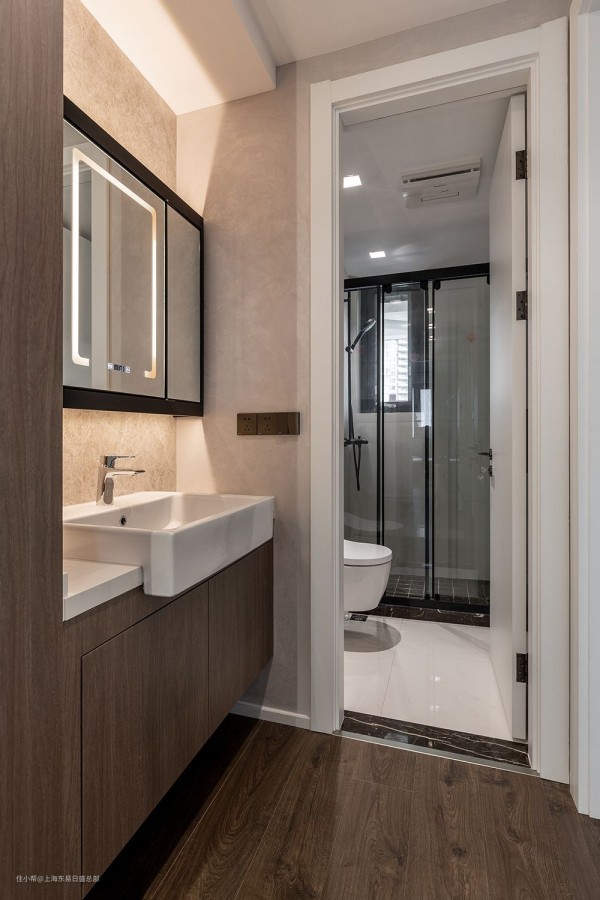 洗手台区域也可以使用新砌墙做隔断,与墙面选用同样的材质,铺贴瓷砖或者防水乳胶漆,打造整体性的视觉空间。