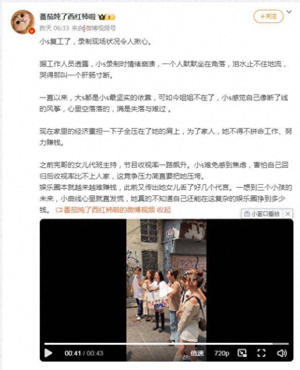 有现场工作人员透露,小S在节目录制过程中,多次突然情绪失控,崩溃,一个人独自坐在角落里崩溃大哭,泪水止不住地流,现场节目组猜测,可能是小S在录制过程中,回想起和大S录制节目的点点滴滴,