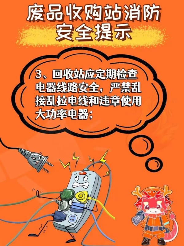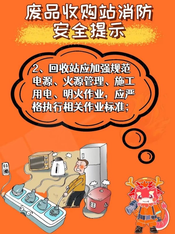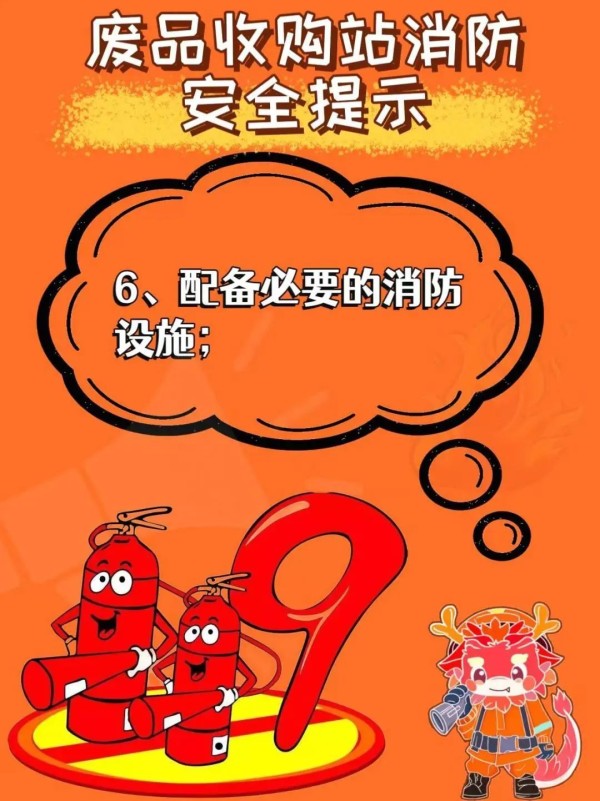 加强废品站防火安全管理首先要严格功能分区:易燃易爆材料存放和办公区、生活区等场所进行区域划分。其次必须保证消防车道的畅通。在经营人员住宿区域,要加强对电器线路的安全检查,严禁乱接乱拉电线和违章使用电器等,规范宿舍用电管理。