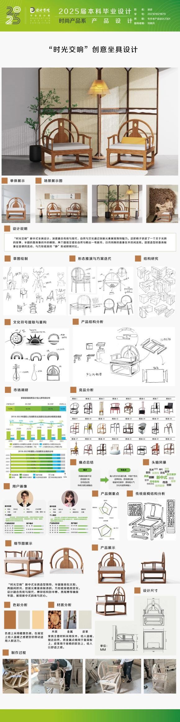 “时光交响”新中式坐具设计,深度融合传统与现代,自然与文化通过创新元素展现独特魅力。这把椅子讲述了一个关于光阴的故事,半圆的靠背像初开的朝阳,两个圆弧交错处自然勾勒出一弯新月,日月同辉的意象在木纹间流转。琵琶造型的靠背板象征音律的流动,与方形底座的“静”形成鲜明对比。