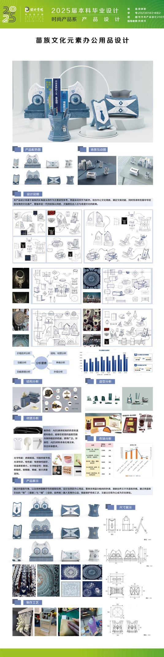 本产品设计来源于苗族的长角苗头饰作为主要造型参考,用蓝染花纹作为配色。结合办公文化用具,满足文具功能,同时传承和发展中华民族宝贵的文化遗产,增强年轻一代的民族认同感,大幅度拉近人们与非遗文化的距离。
