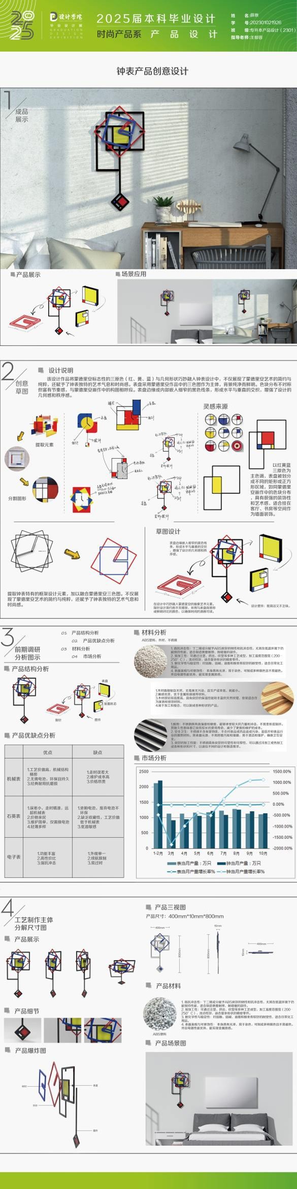 该设计作品将蒙德里安标志性的三原色(红、黄、蓝)与几何形状巧妙融入钟表设计中,不仅展现了蒙德里安艺术的简约与纯粹,还赋予了钟表独特的艺术气息和时尚感。表盘采用蒙德里安作品中的三色图作为主体,背景纯净而鲜明。色块分布不对称但富有节奏感,与蒙德里安画作中的构图相呼应。表盘边缘或内部嵌人细窄的黑色线条,形成水平与垂直的交织,增强了设计的几何感和秩序感。