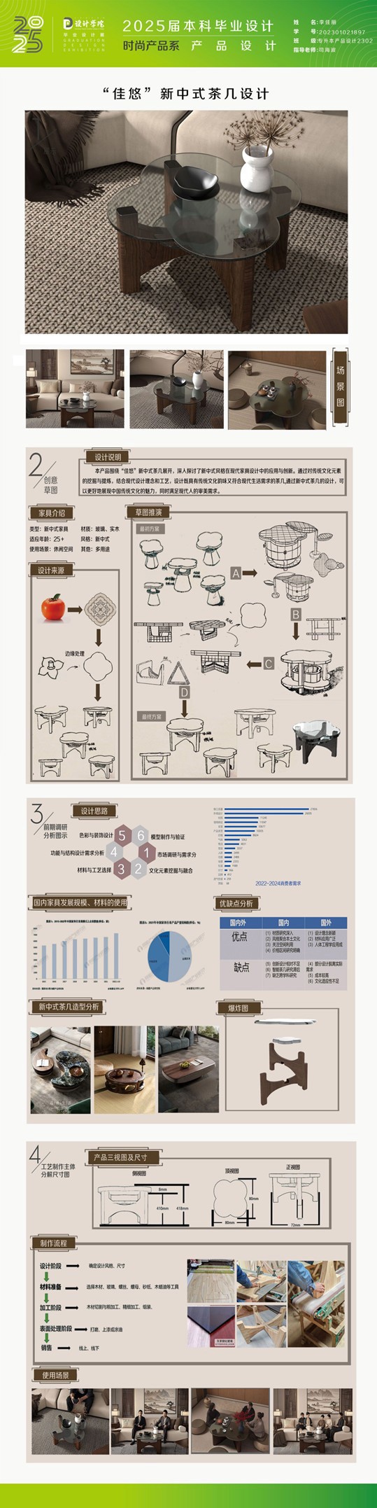 本产品围绕“佳悠”新中式茶几展开,深入探讨了新中式风格在现代家具设计中的应用与创新。通过对传统文化元素的挖掘与提炼,结合现代设计理念和工艺,设计既具有传统文化韵味又符合现代生活需求的茶几,通过新中式茶几的设计,可以更好地展现中国传统文化的魅力,同时满足现代人的审美需求。
