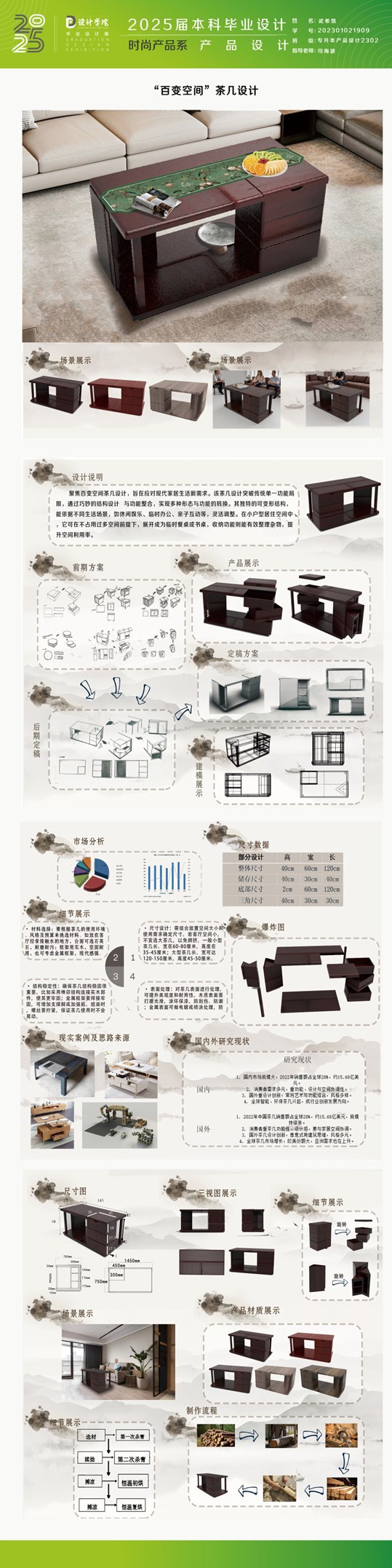 聚焦百变空间茶几设计,旨在应对现代家居生活新需求。该茶几设计突破传统单一功能局限,通过巧妙的结构设计与功能整合,实现多种形态与功能的转换。其独特的可变形结构,能依据不同生活场景,如休闲娱乐、临时办公、亲子互动等,灵活调整。在小户型居住空间中,它可在不占用过多空间前提下,展开成为临时餐桌或书桌,收纳功能则能有效整理杂物,提升空间利用率。