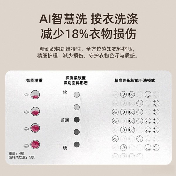 AI智能洗护:凭借先进的AI智控技术,自动感知衣物特性,智能匹配最优洗涤方案,有效减少衣物损伤。这种精准洗护,不仅让衣物焕然一新,还大幅延长了服饰的使用寿命,彰显出贴心与科技融合的魅力。