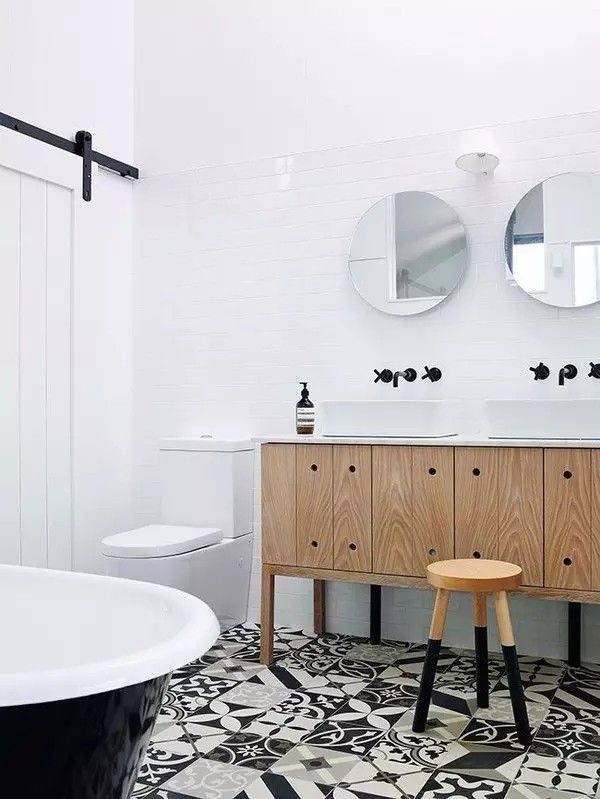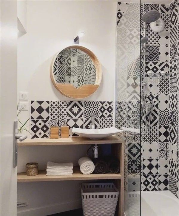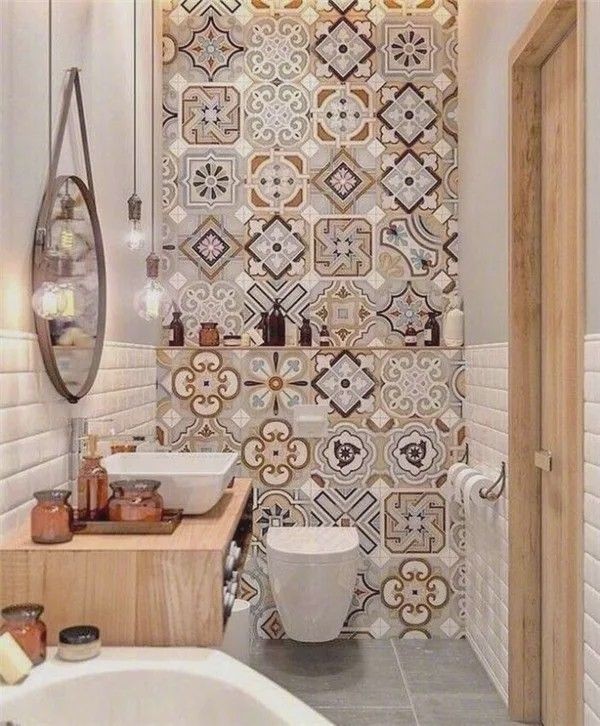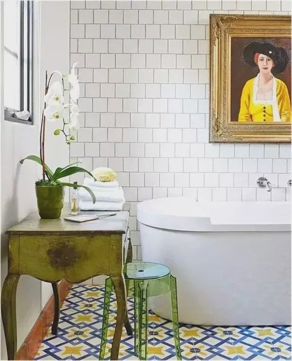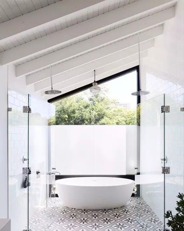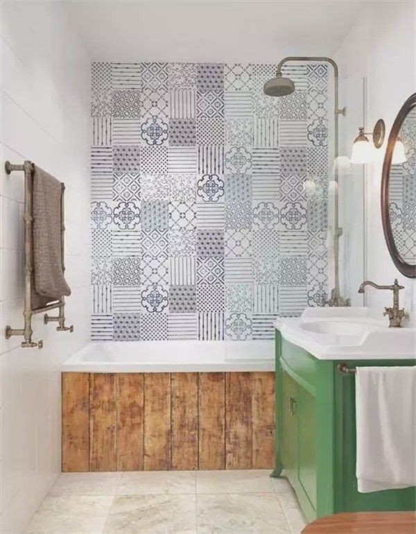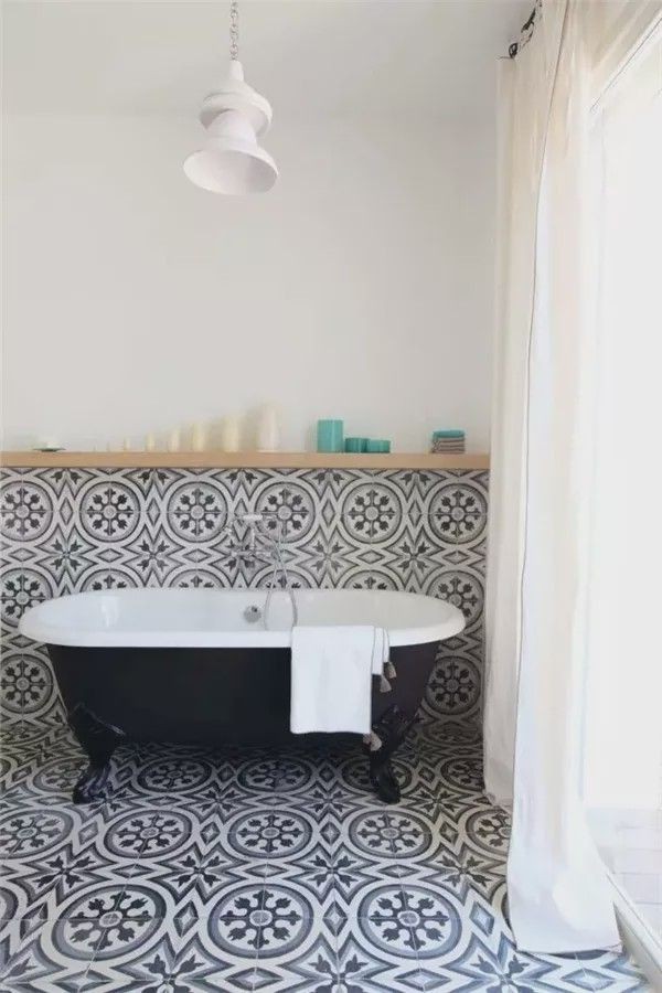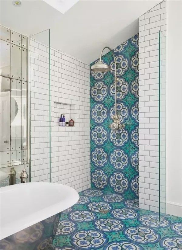 一面花砖墙让沐浴变得更加诗意,但要注意比起满墙式铺贴,适当的留白和单墙式的铺贴,更适合于小面积的浴室空间。